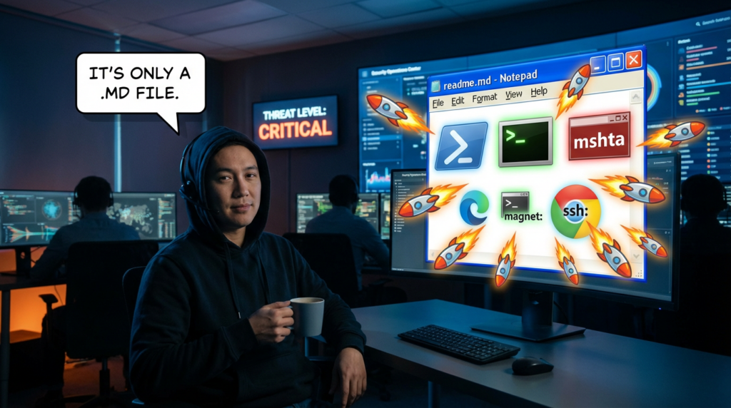That user-interaction requirement lowers the hype but should not lower the priority. Enterprise attacks routinely rely on one click. Many successful intrusion chains do not require memory corruption and do not begin with an exploit kit. They begin with a trusted workflow and a manipulated transition. In the case of CVE-2026-20841, the trust anchor is especially strong because users do not think of opening a Markdown file in Notepad as crossing into a risky application domain. The user is not opening an executable, not enabling a macro, and not running a script directly. They are reading what appears to be text. That is precisely why this class of bug is effective in practice. (السجل)