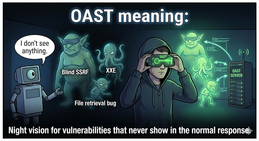 هذا هو المكان OAST (اختبار أمان التطبيقات خارج النطاق) يصبح أمرًا بالغ الأهمية. يتطلب فهم معنى OAST تجاوز دورات الطلب/الاستجابة القياسية والنظر إلى التفاعلات غير المرئية التي يجريها التطبيق مع الشبكة الخارجية.