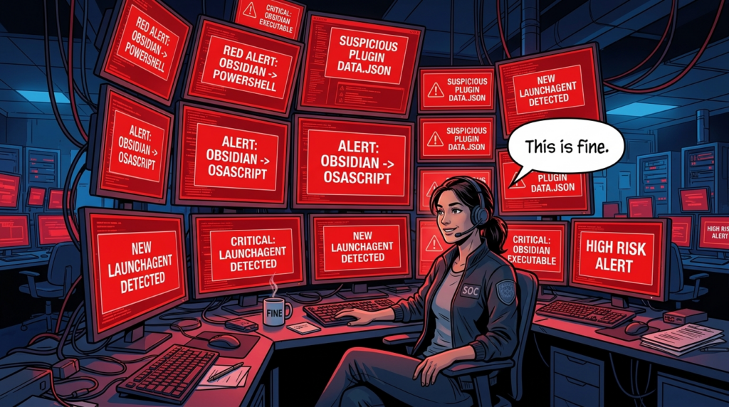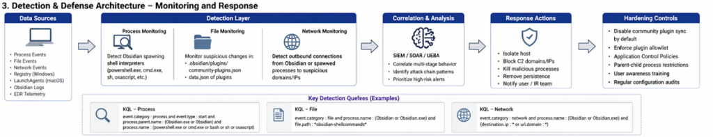 That observation suggests a practical hierarchy of detection priorities. First, watch for trusted collaboration or desktop knowledge tools launching shells or script interpreters they do not normally need to launch. In Elastic’s KQL examples, the core rule is straightforward: look for Obsidian as the parent of powerhell.exe, cmd.exe, sh, باش, zsh, or related interpreters. Second, watch for file activity involving known execution-capable plugin paths, especially under .obsidian/plugins/. Third, on macOS, monitor for suspicious osascript execution and new LaunchAgent entries whose parent lineage points back to user-facing desktop software rather than installer or admin workflows. (Elastic)