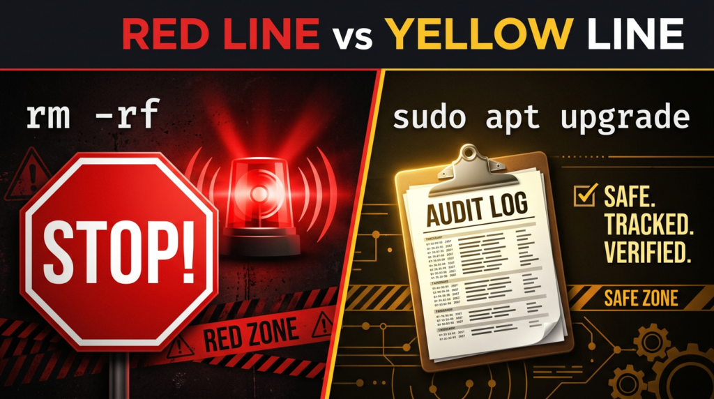 | Yellow line | Allowed but must be logged with time, reason, and result | sudo, service restarts, firewall changes, installs, immutable flag changes | agent executes, then writes an audit entry |