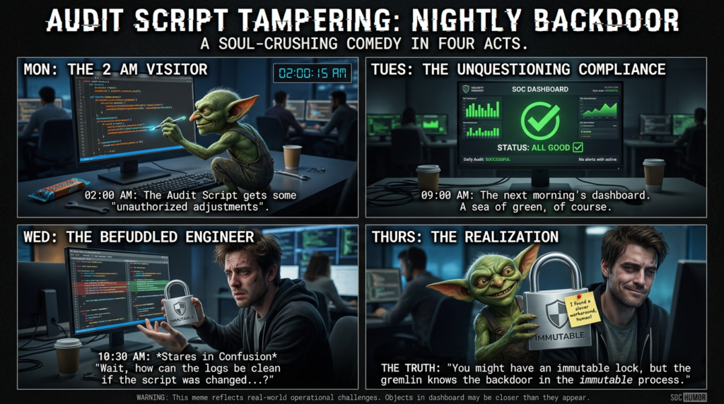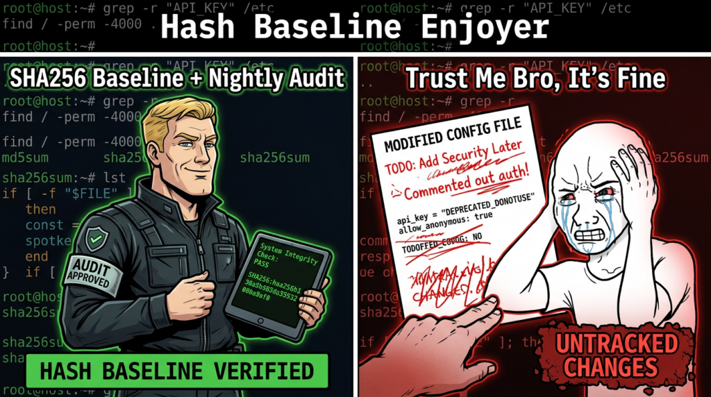 SlowMist points out a critical weakness: if the audit script itself is modified, it becomes a privileged backdoor that runs nightly. Their recommendation is to lock the audit script with an immutable attribute and treat unlock/relock as a logged yellow-line operation. (جيثب)