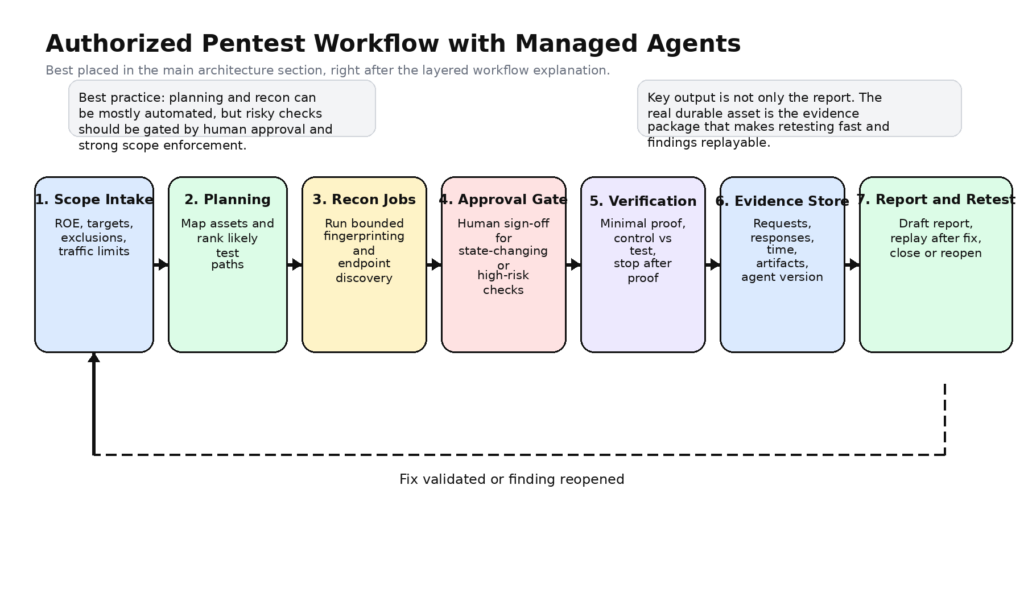 The fourth is retesting. Retests are a perfect candidate for managed agents because the hypothesis is no longer open-ended. The old finding exists. The fix exists. The test window is usually tight. The expected evidence is known. The challenge is discipline, not ideation. A session-based agent can walk through prior evidence, fetch the current fix context, rerun the exact bounded checks, compare results, and produce a clean pass-fail retest record. (NIST CSRC)