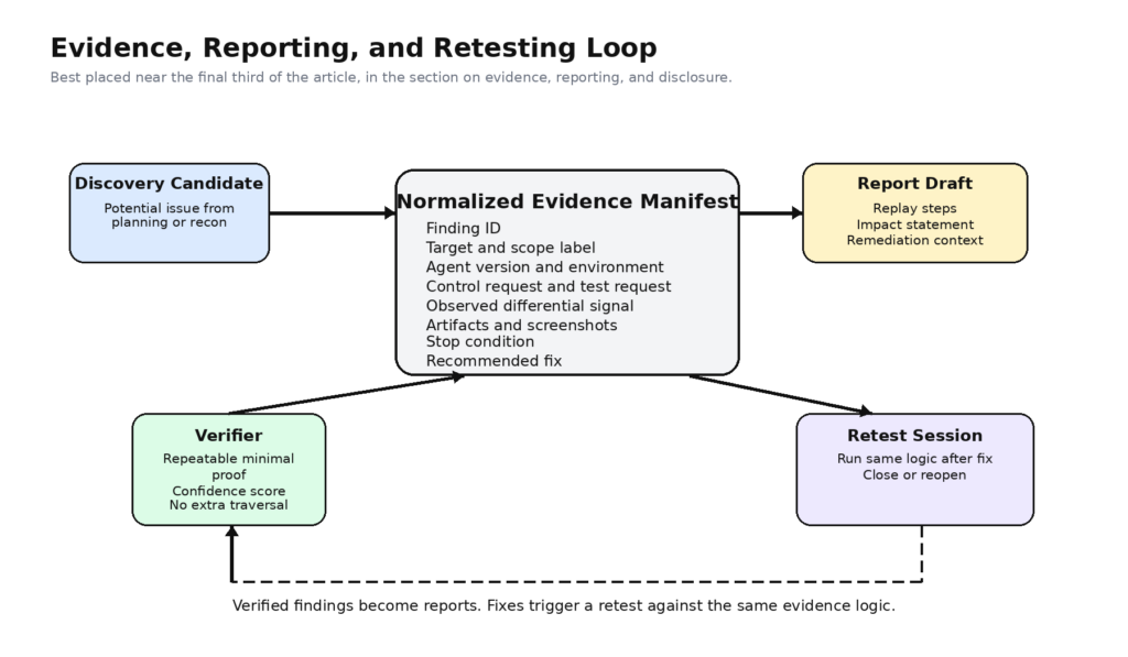 Verification deserves its own layer because it is a different cognitive task. Discovery asks, “Could this be something?” Verification asks, “Can I prove this is real with the smallest necessary action?” Good verification is conservative. It relies on control-versus-test comparisons, minimal payloads, repeatable observations, and explicit stop conditions. A verifier agent or verifier tool family should be optimized for falsifying the claim, not for defending it. If the only goal is to accumulate wins, the false-positive rate will climb until the whole system becomes expensive noise.