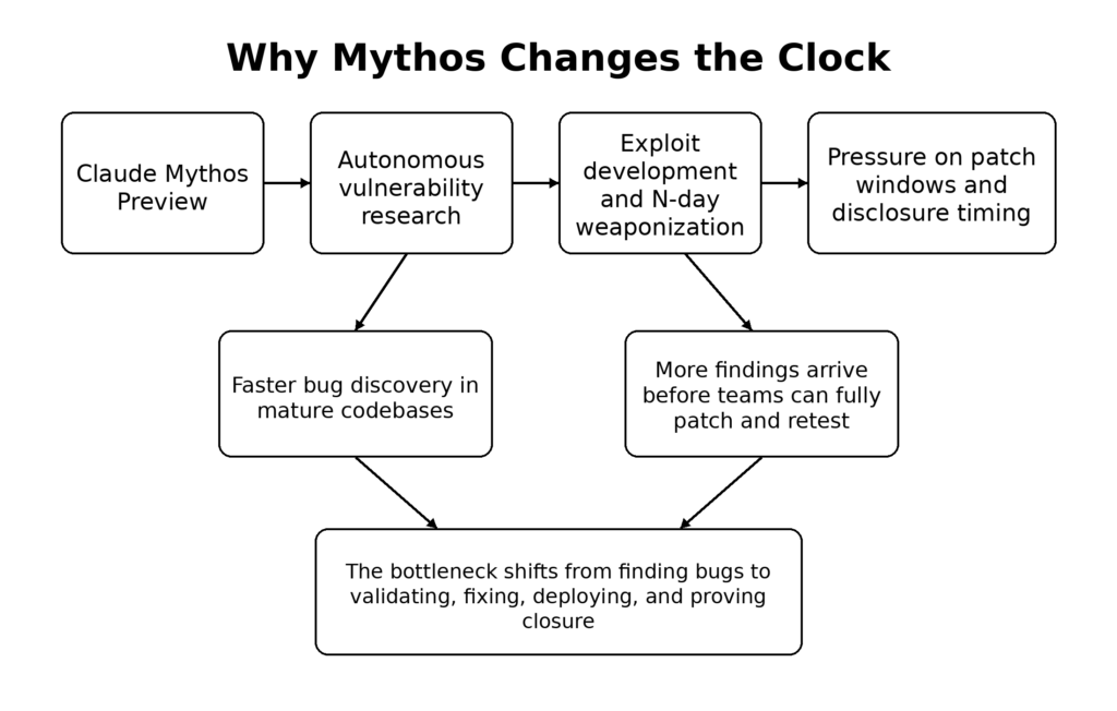 What Mythos changes first is not the philosophical question of whether AI can hack. That question is already obsolete. What it changes is the clock. It shortens the interval between discovery and usable insight. It threatens to shorten the interval between patch availability and exploitability. It raises the value of verifiers, candidate patches, and retests. It makes disclosure throughput and patch governance part of the security perimeter. Teams that understand that will adapt in time. Teams that wait for perfect public proof of every claim will probably still get there, but they will get there later than they should. (red.anthropic.com)