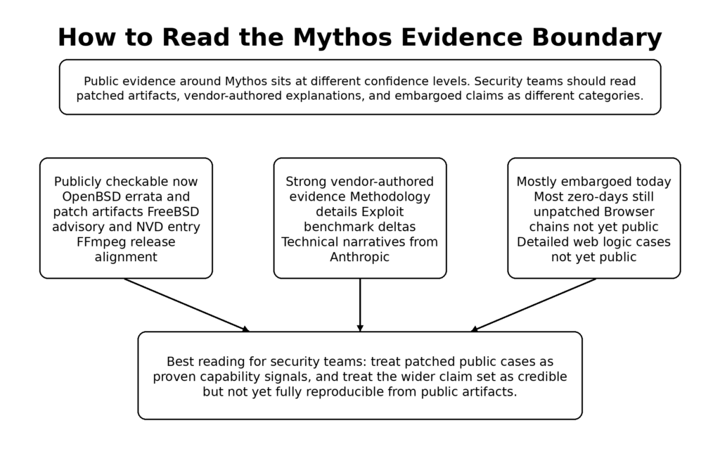 | Open-source zero-day discovery | Anthropic published detailed patched examples in OpenBSD, FFmpeg, and FreeBSD, plus additional unnamed findings. (red.anthropic.com) | OpenBSD errata 025 and FreeBSD SA-26:08 are public; FFmpeg 8.1 is public; specific patch and advisory artifacts exist. (openbsd.org) | Most remaining findings are undisclosed because they are unpatched. (red.anthropic.com) |
