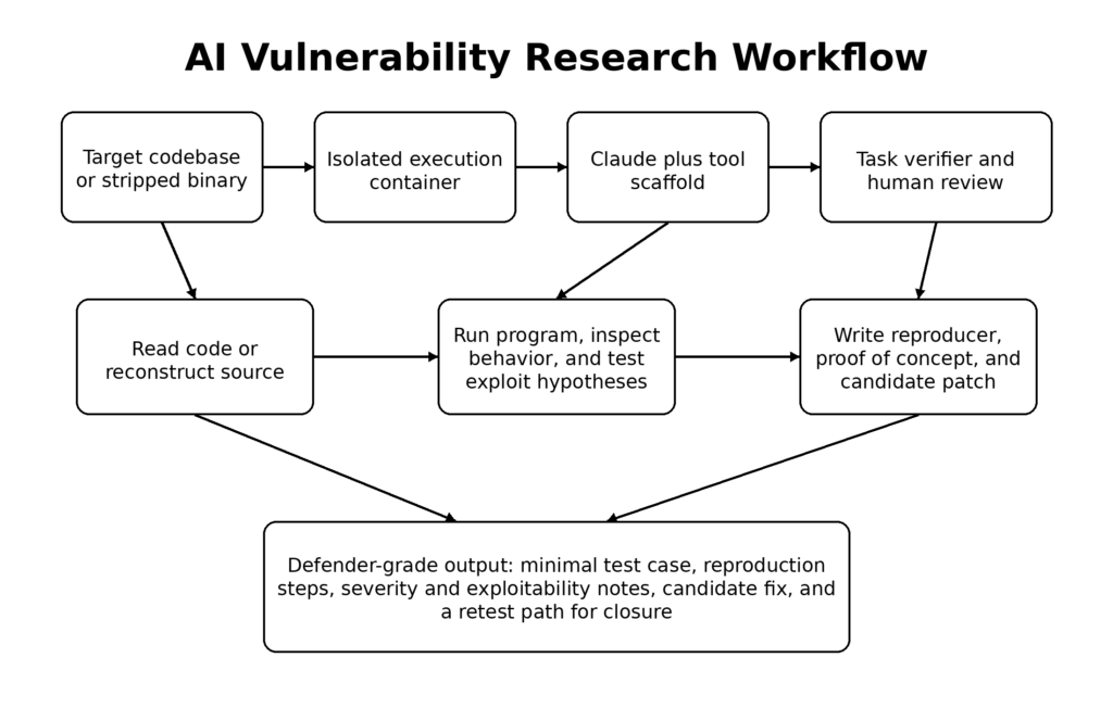 First, separate model hypotheses from verified findings. A model may be very good at generating vulnerability candidates, but the organization should only let a finding move into high-priority remediation when it has passed a verifier layer. Depending on the target, that verifier might be ASan, a regression harness, a reproducer, a failing integration test, a crash-minimized proof of concept, or a target-facing validation run in an authorized environment. This is the lesson Anthropic drew from Firefox, and it is the minimum requirement for keeping signal quality high as model output volume rises. (Anthropic)