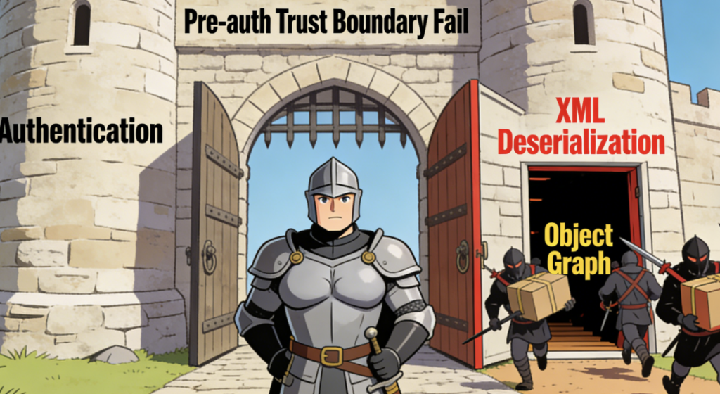That’s the boundary failure: parsing untrusted structured input into executable object graphs before authentication. Once that boundary fails, the attacker does not need to defeat a login. They only need the service reachable.