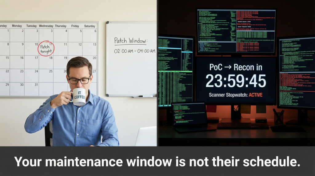 Separately, public reporting and threat intel commentary describe a familiar progression: PoC appears or technical detail becomes actionable, reconnaissance begins quickly, and exploitation attempts follow on the heels of scanning. GreyNoise explicitly describes reconnaissance beginning within roughly a day of PoC visibility, which is the kind of empirical “time-to-probe” number that changes how you justify emergency windows. (GreyNoise)