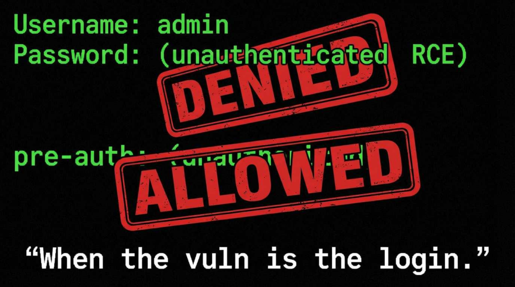 Critically, this is pre-authentication. An attacker does not need credentials, a session token, or a VPN connection if the appliance is internet-facing. They simply need network access to the web interface.