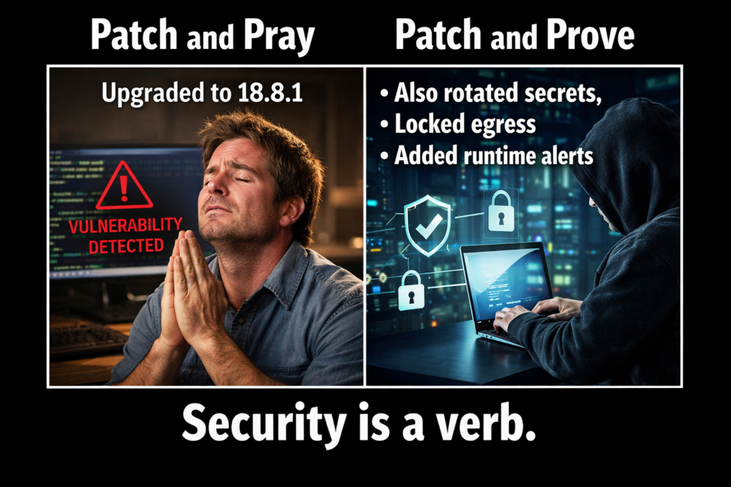 If you ran a vulnerable version, do not stop at patching. Treat it as: “patch + hunt + rotate secrets + validate controls.”
