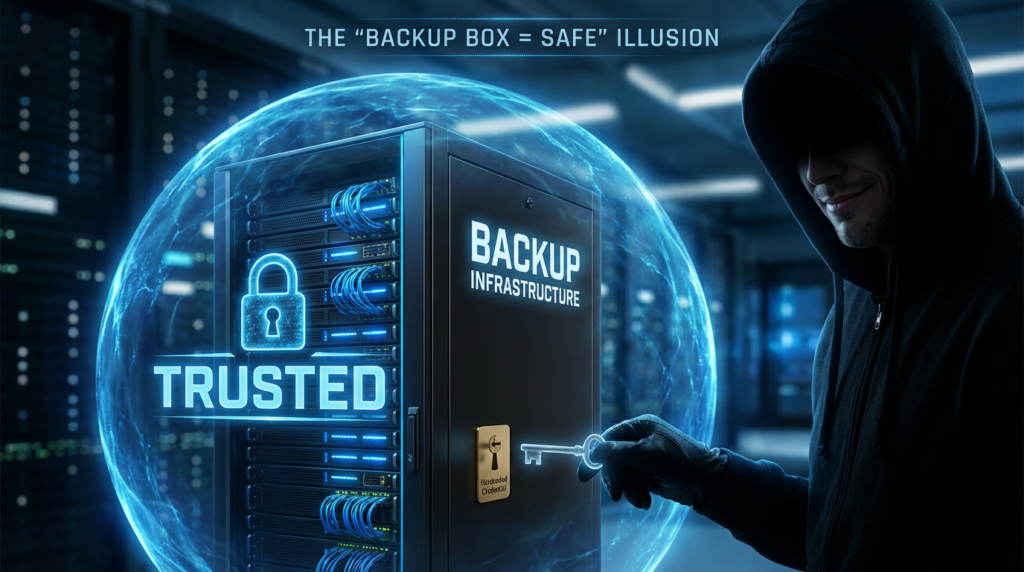 Hardcoded credentials are always bad. They are uniquely catastrophic in disaster recovery and backup systems for two structural reasons.