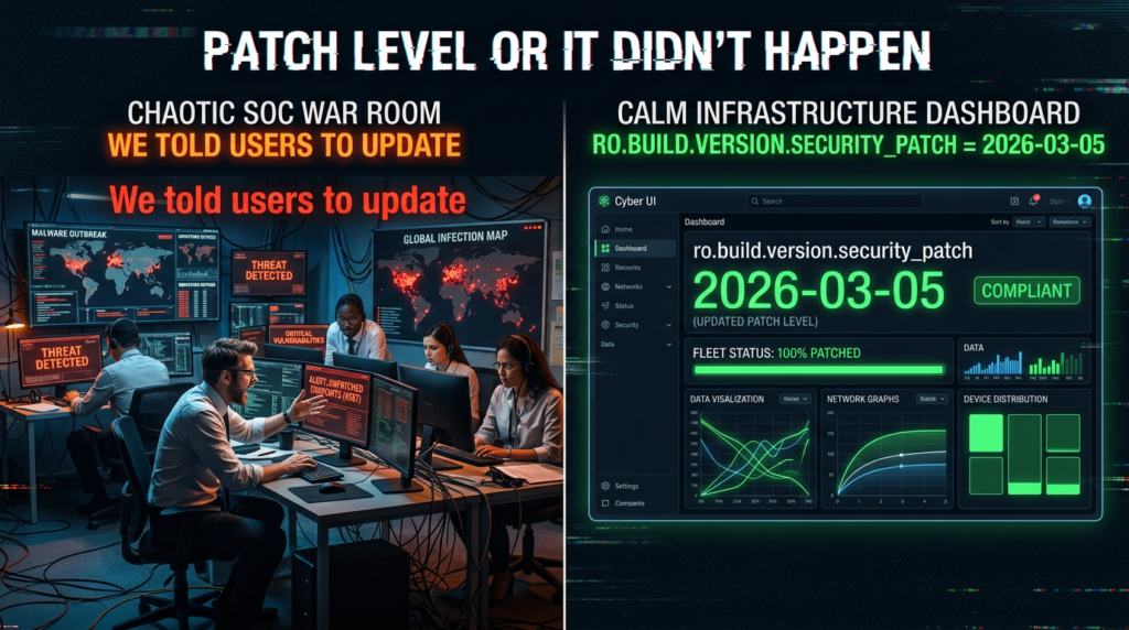 - Produce remediation proof, not promises Your evidence is the device’s patch string (and related inventory metadata), collected centrally and retained. Google explicitly describes how OEMs should set the patch string and how 2026-03-05 relates to the full bundle. (Android Open Source Project)