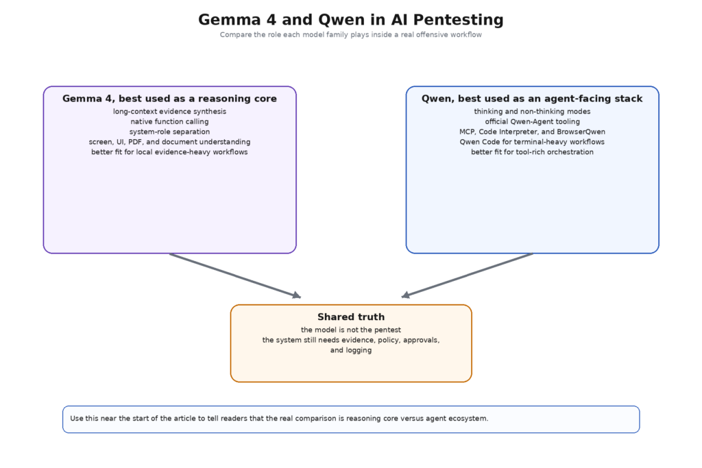 Even that table can mislead if read too casually. The fact that Qwen has a broader official tooling surface does not automatically make it better for AI pentesting. It means Qwen is easier to position as a model family inside an agent stack. The fact that Gemma 4 puts multimodality, system-role support, function calling, and local deployability into a single documented family does not automatically make it stronger overall. It means Gemma is easier to position as a controlled local reasoning layer. Those are different system-design choices, and a pentesting team can reasonably prefer one or the other based on where the most expensive part of its workflow lives. (Google AI for Developers)
