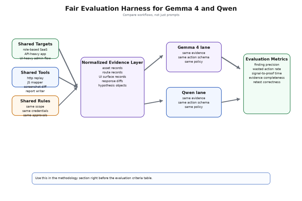 A useful evaluation harness also needs a strict configuration layer. Same target class, same tool wrappers, same evidence schema, same approval rules, same operator policy, same rate limits, same credential boundaries. If Gemma 4 gets screenshots and Qwen does not, the result is meaningless. If Qwen gets Qwen-Agent and Gemma gets only raw chat prompts, the result is meaningless. If one model is allowed to emit direct execution strings and the other must emit typed actions, the result is worse than meaningless because it teaches the wrong lesson. (OWASP Gen AI Sicherheitsprojekt)