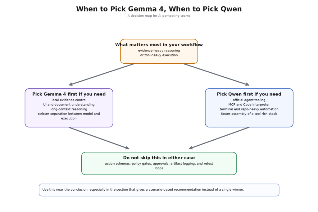 The biggest practical mistake is forcing one answer across all three scenarios. A local evidence-heavy workflow, a terminal-heavy agentic workflow, and a multimodal GUI-heavy workflow are not the same thing. Gemma 4 tends to win the first one more cleanly. Qwen tends to win the second one more cleanly. The third one depends on whether the Qwen side is allowed to expand into Qwen3-VL. Once you say that out loud, most of the false certainty around “best model for AI pentesting” disappears. (Google AI for Developers)