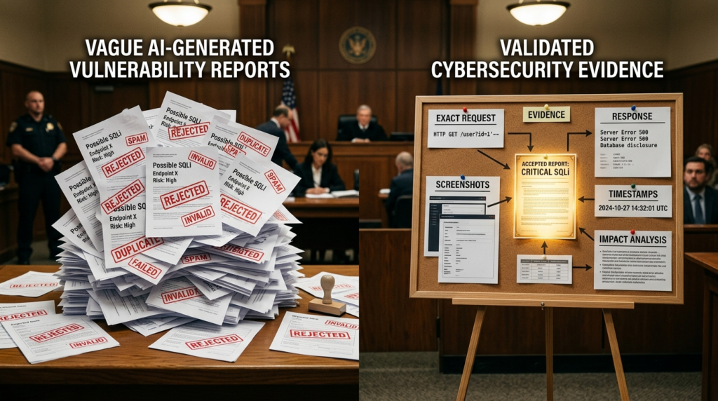 The fourth is pasting scanner output into a model and submitting whatever came back. Bugcrowd’s own researchers describe AI as a way to clean scanner noise, remove duplicates, and suggest verification steps. That is the right posture. AI should reduce slop, not manufacture it. (Bugcrowd)