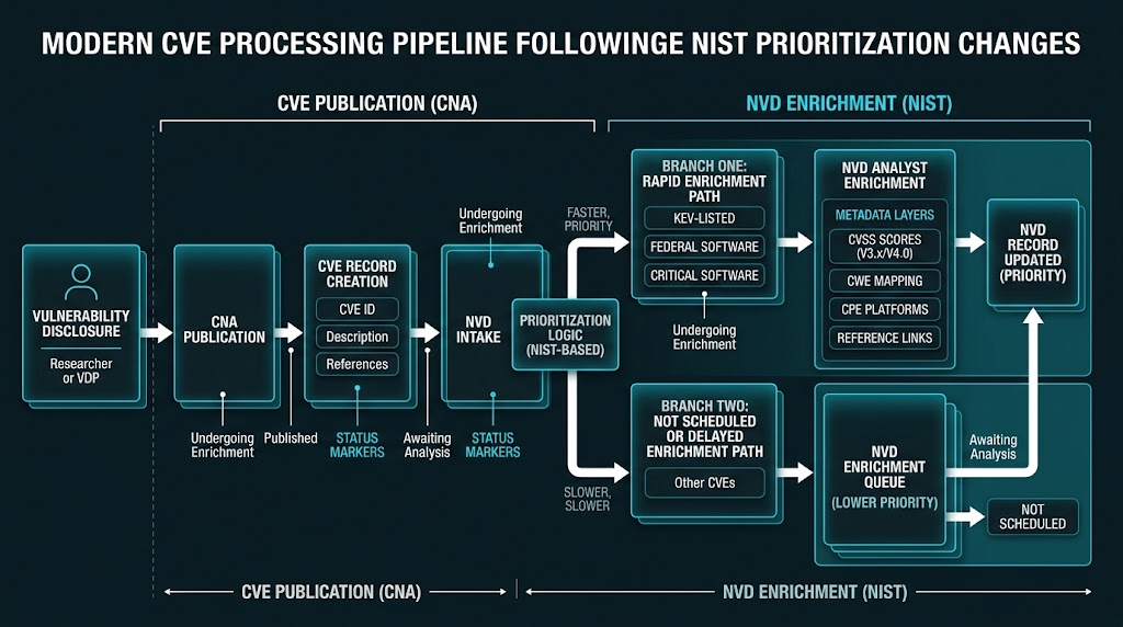 The new criteria are straightforward. NIST will prioritize CVEs in CISA’s Known Exploited Vulnerabilities catalog, CVEs for software used within the federal government, and CVEs for critical software under Executive Order 14028. NIST’s own process page adds an important operational detail: CVEs published to the CVE List are typically available in the NVD within an hour, but enrichment time varies based on information availability and publication volume. In other words, publication and enrichment are now clearly separate phases. A CVE can be real, public, and operationally urgent before NVD has completed all the scoring and product-matching that downstream tools may be expecting. (NIST)
