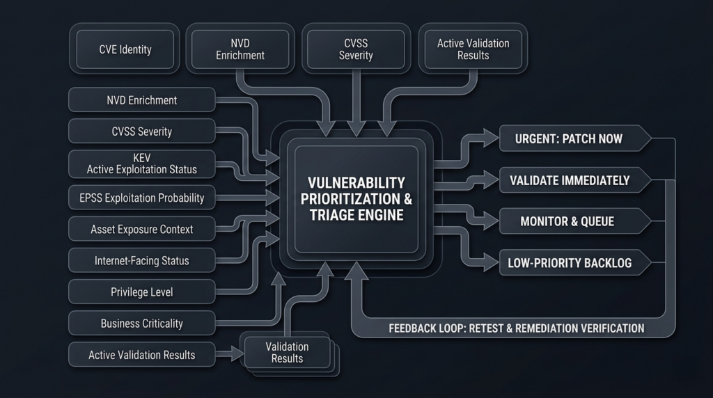 A workable 2026-era prioritization stack starts by separating identity, exploitability, exposure, consequence, and proof. Too many programs still collapse all five into one score or one ticket field. That was barely tolerable when the enrichment layer felt stable. It is not tolerable now. The better model is to ask a sequence of questions in order. Is the record real and attributable to a product or feature we care about. Is there evidence of real exploitation or high short-term exploit probability. Are we actually exposed in a reachable way. Would compromise matter on this asset. Can we validate exploitability or confirm mitigation in a controlled way. Each stage narrows uncertainty. (nvd.nist.gov)