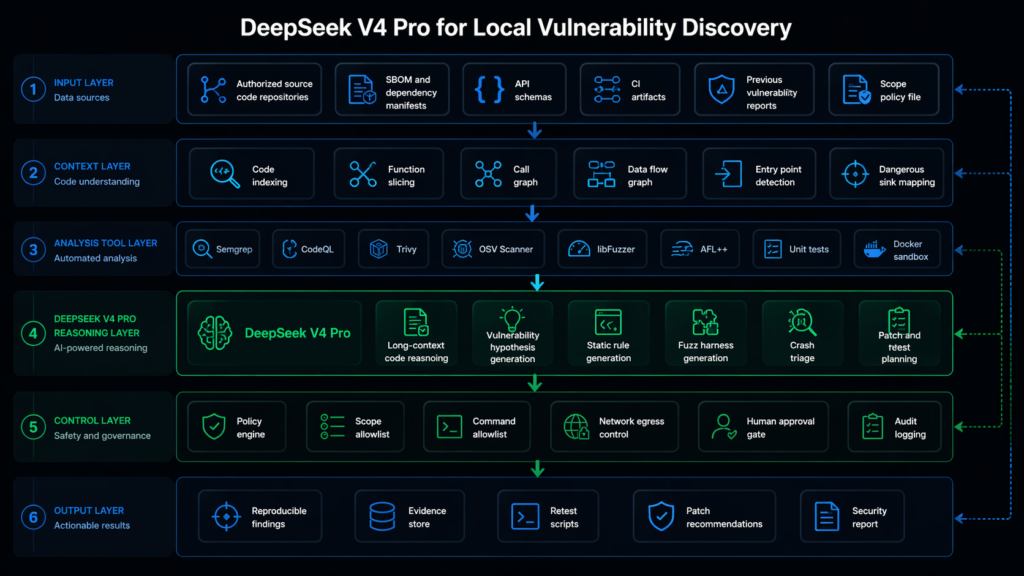 DeepSeek V4 Pro can be useful for local automated vulnerability discovery. It is not a magic bug hunter. The practical answer is more interesting than either hype or dismissal: DeepSeek V4 Pro can become the reasoning layer inside a controlled vulnerability research system, but the system still needs static analysis, fuzzing, sandbox execution, policy controls, evidence capture, and human review.