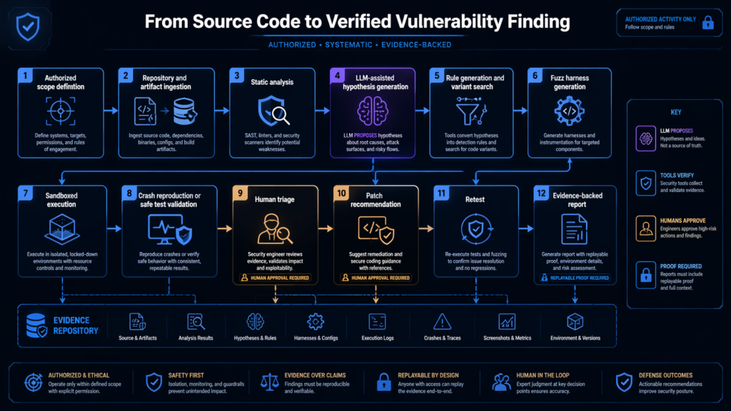 The most important design principle is simple: the model should not be the source of truth. The model proposes. Tools test. Sandboxes reproduce. Humans approve disclosure and remediation. Evidence wins.