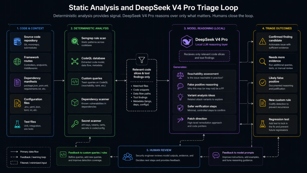DeepSeek V4 Pro is relevant because vulnerability research is heavily context-bound. A serious bug often sits across multiple files, build flags, parser states, authorization checks, API schemas, dependency versions, or business rules. Long context and strong code reasoning can help, especially when the pipeline feeds the model curated evidence rather than dumping an entire repository into one prompt.
