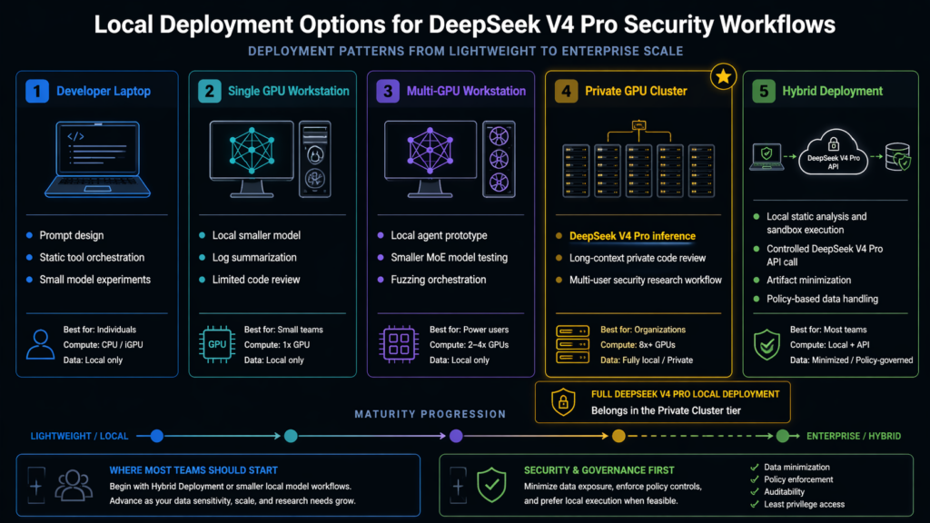 | Full local DeepSeek V4 Pro | Large security labs, AI security vendors, enterprises with accelerator clusters | Maximum control over code and artifacts | High hardware, operations, and serving complexity |