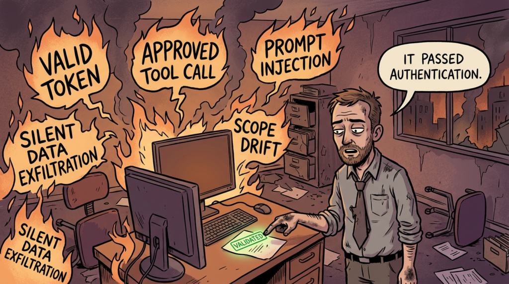 What makes this dangerous in practice is that the logs may still look clean. The access token is valid. The API endpoint is approved. The tool call format is syntactically correct. The account is one the organization intentionally provisioned. Everything looks legitimate except the result.