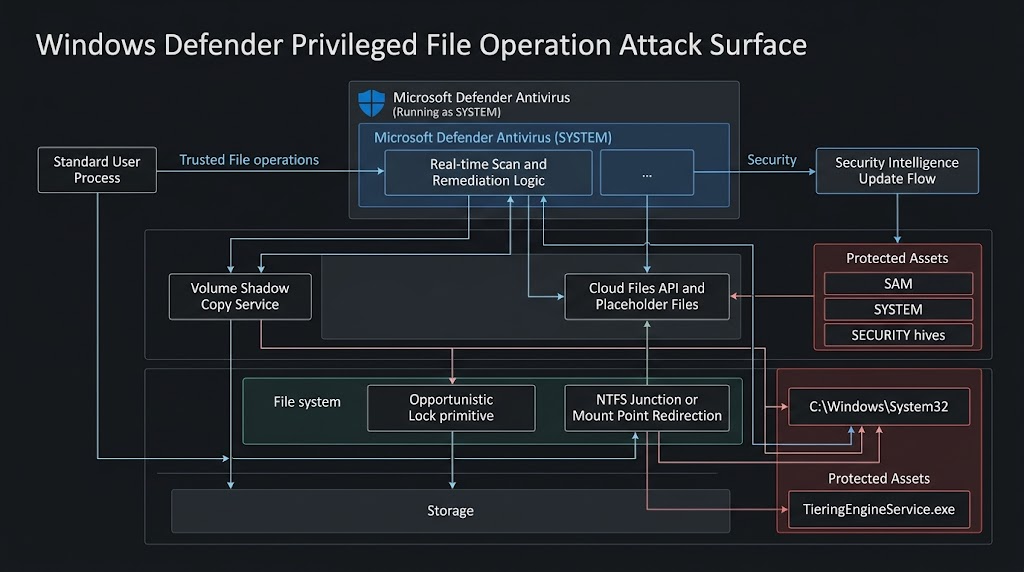 It also explains why these issues are difficult to mitigate cleanly. If the exploit depended on one obviously unnecessary component, defenders could just disable it. But the chains described publicly touch VSS, update logic, placeholder behavior, oplocks, mount points, and legitimate service execution. Disabling any one of those globally may damage backups, cloud sync, storage behavior, or the antivirus itself. That is why behavioral detection and post-patch validation matter so much in this case. (learn.microsoft.com)