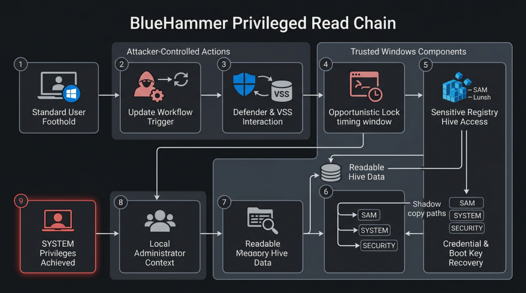 Cyderes’ writeup is especially useful here because it frames the issue in a way practitioners immediately understand. According to its analysis, BlueHammer does not require a kernel exploit, memory corruption, or arbitrary code execution inside Defender. It abuses Microsoft Defender’s update workflow together with Volume Shadow Copy Service, the Windows Cloud Files API, and opportunistic locks. Each building block is legitimate. The dangerous behavior appears only when the chain is assembled in the right order. That is a very different category of problem from a classic “bad pointer, get ring 0” story. (cyderes.com)