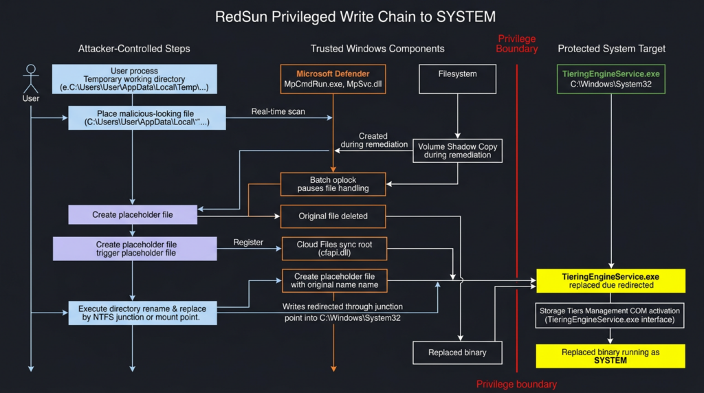 If BlueHammer is the read-path lesson, RedSun is the write-path escalation of the same broader idea. Cyderes says RedSun achieves local privilege escalation from a standard user account to SYSTEM on Windows 10, Windows 11, and Windows Server 2019 and later by abusing Defender’s real-time scanning path. Unlike BlueHammer, which pivots through credential material, RedSun is described as taking a SYSTEM-privileged file write and steering it into C:\Windows\System32, then letting Windows execute the replaced binary as SYSTEM. (cyderes.com)