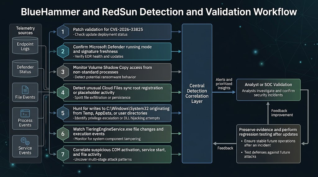 This comparison also makes clear why defenders should not reduce the story to “Microsoft Defender bug gets you SYSTEM.” The mechanism matters because the mechanism determines what telemetry exists, what controls are useful, and what compensating steps remain available when a vendor patch does not yet exist. BlueHammer encourages defenders to look for suspicious access to shadow-copy-backed hive paths and post-read credential activity. RedSun pushes defenders toward path redirection, unusual System32 writes, COM-triggered service execution, and abnormal Cloud Files API usage. (cyderes.com)