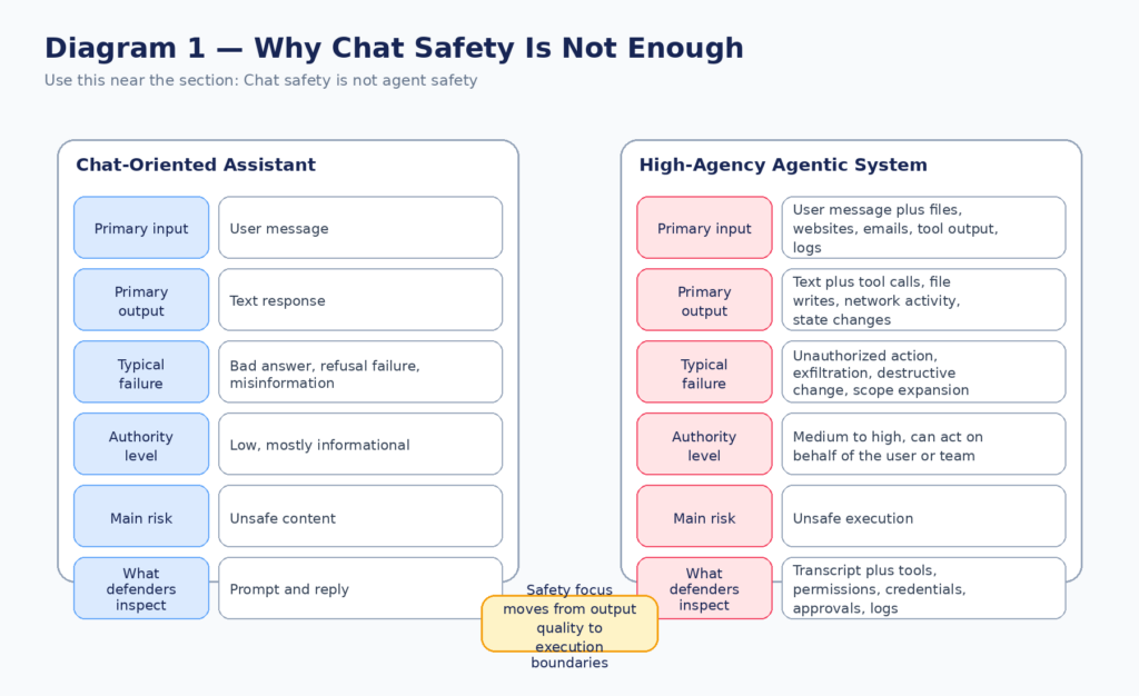 Typical failureBad answer, refusal failure, misinformationUnauthorized action, exfiltration, scope escalation, destructive change