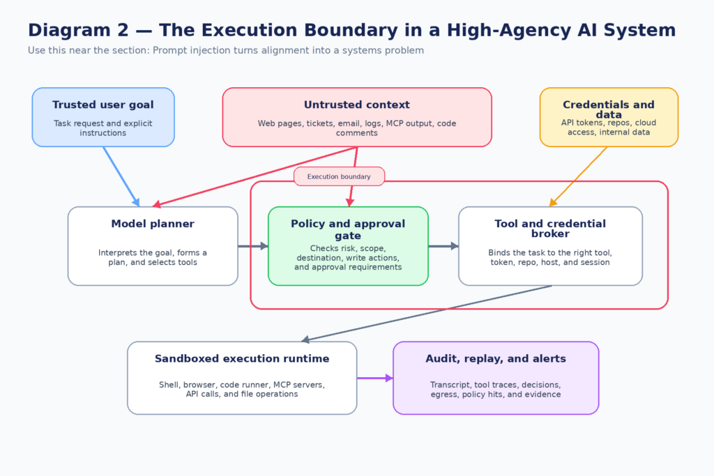If alignment were only about a model’s internal objectives, the story would still be hard. But the real world adds a second force: external manipulation. This is where the discussion can get sloppy, because prompt injection is sometimes treated as a separate topic from alignment. In practice, the two interact. A high-agency model with real tools is most dangerous when either internal initiative or external influence can push it across the same boundary. The runtime does not care which side won the argument inside the transcript. The action happened anyway. (openai.com)