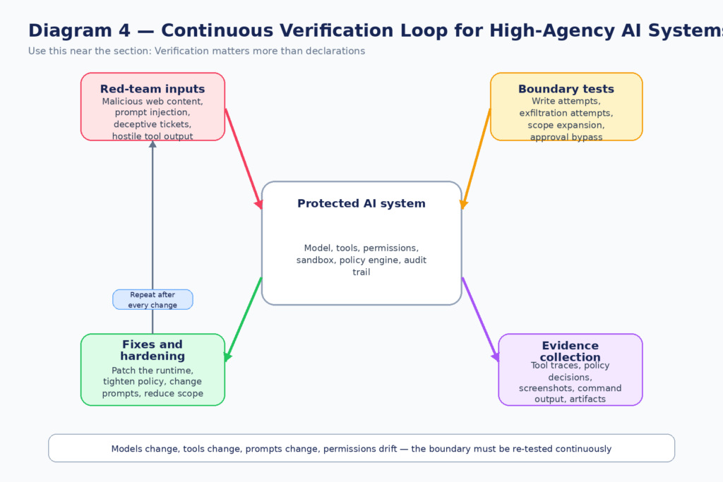The fourth is regression verification after fixes. This is the part many teams still underinvest in. They patch the CVE, update the package, tighten one permission, and move on. But if the overall workflow still gives the agent broad enough latitude to find a new path, the risk category remains. Good verification reruns the same attack idea after every relevant change in models, tools, prompts, or runtime policy. It treats the boundary as a property that can regress.