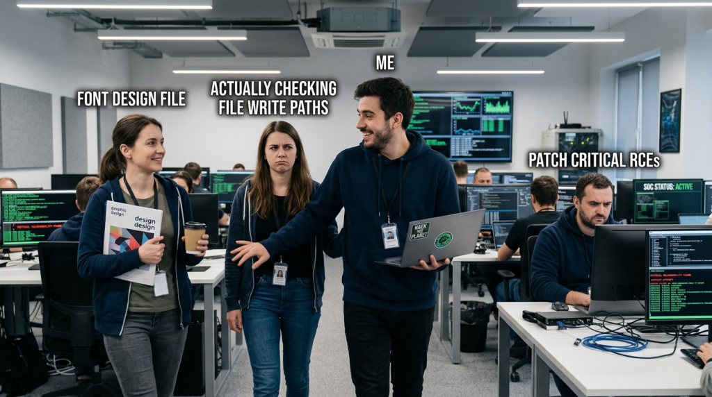 The reason this matters is not “fonts” in the abstract. It matters because modern software systems automate everything. Build workers compile design assets. SaaS platforms ingest user-supplied files. CI jobs pull repositories and generate artifacts. Internal tools process untrusted uploads because someone assumed a design file was less dangerous than a script, a template, or an archive. CVE-2025-66034 breaks that assumption. It shows how a structured design artifact can become a filesystem write primitive, and in the wrong environment, a code execution path. (fontTools Documentation)