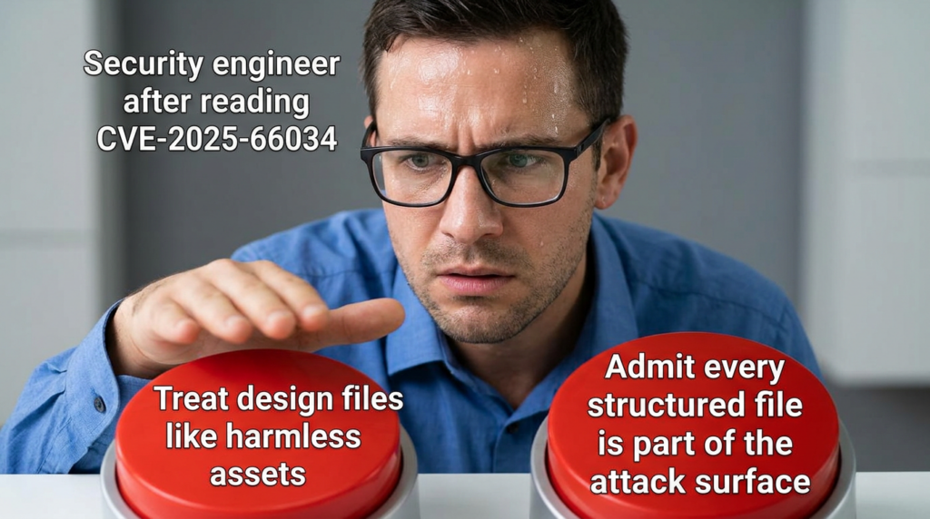 This does not magically eliminate every risk in your build chain, but it enforces the right habits. Verify version. Validate input. Narrow the working directory. Keep output rooted. Treat design artifacts as untrusted unless proven otherwise. CVE-2025-66034 is the kind of bug that punishes teams for skipping exactly those steps. (GitHub)