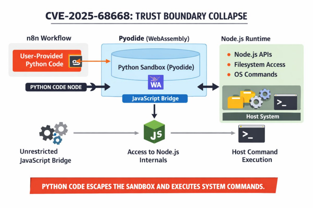 En esencia, CVE-2025-68668 (CVSS 9.9) es un Fallo del mecanismo de protección que afecta a las versiones n8n de 1.0.0 hasta 2.0.0. Se dirige específicamente a la implementación de Python Code Node que depende de Piodurouna adaptación de CPython a WebAssembly/Emscripten.