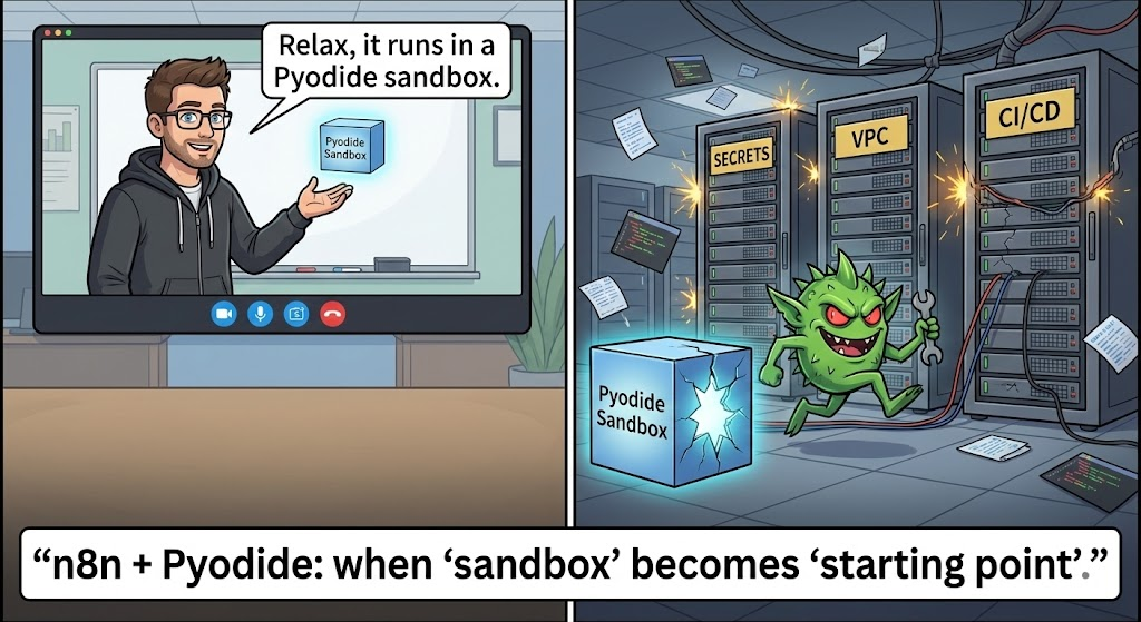 Mientras que Pyodide está diseñado para ejecutar Python de forma segura en entornos restringidos, la implementación en el backend n8n no pudo hacer cumplir estrictamente los límites de aislamiento.