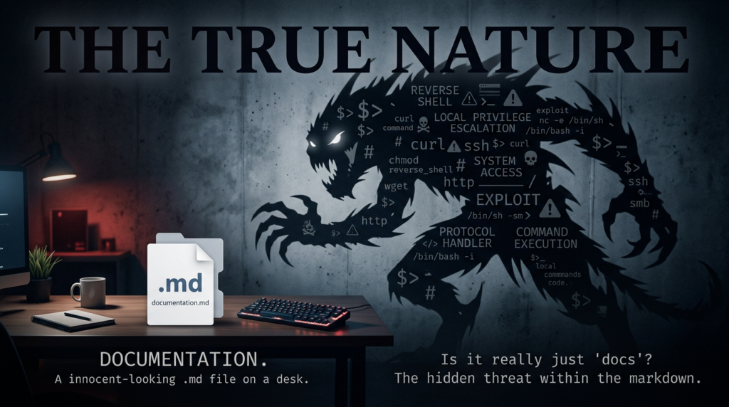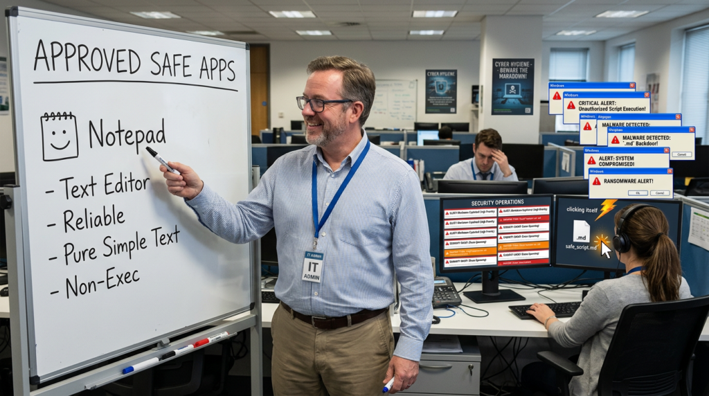 The first stage is delivery. The attacker does not need to target Notepad explicitly in the lure language. Any workflow that places a Markdown file in front of the user can work: internal documentation, release notes, troubleshooting instructions, dev notes, compliance evidence, or a “readme” attached to a project handoff. Markdown is credible because it belongs in modern work. Public writeups consistently describe the need to trick a user into opening a malicious file and interacting with it. (Zero Day Initiative)