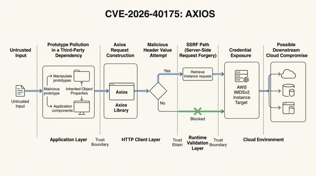 The easiest way to overstate CVE-2026-40175 is to compress the chain into a single label. The advisory itself is longer and more conditional than that. It describes a progression: prototype pollution or a similar upstream taint source, use of that data in Axios request construction, header injection, possible request smuggling or SSRF, possible AWS IMDSv2 abuse, and then a much more environment-specific end state such as credential theft or code execution. Each step adds a condition. (NVD)