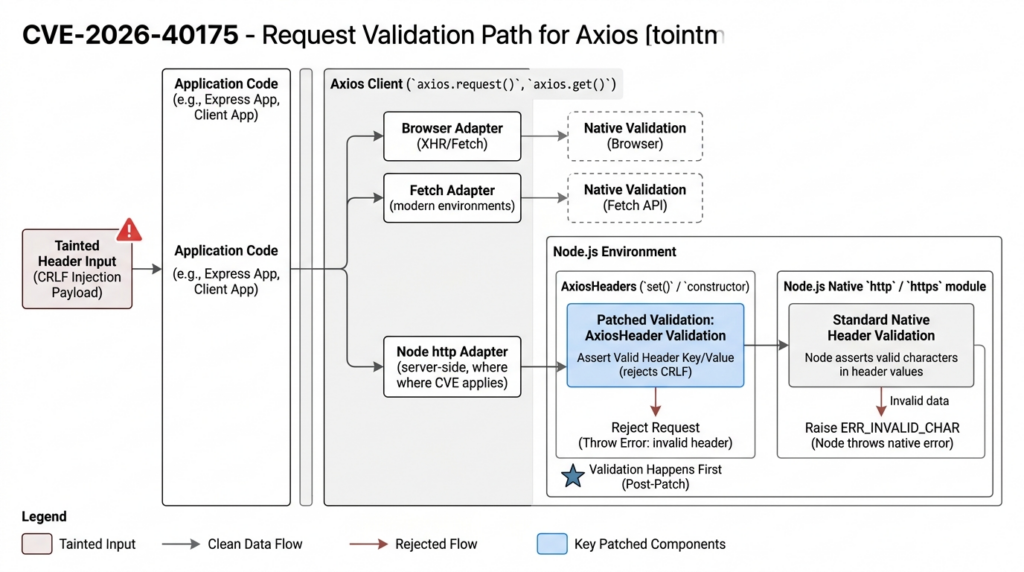 Defenders should resist two lazy conclusions here. The first is “the advisory said cloud compromise, so every vulnerable Axios version is a near-automatic high-severity incident.” The second is “Node blocks CRLF, so the CVE is meaningless.” Both are too crude. Node’s validation makes some paths materially harder. Axios’s own fix closes the sink earlier and across adapters. But the record still describes a real class of trust-boundary failures, and not every deployment is a plain default Node client with no custom transport, proxy, or request-shaping logic in front of it. (GitHub)
