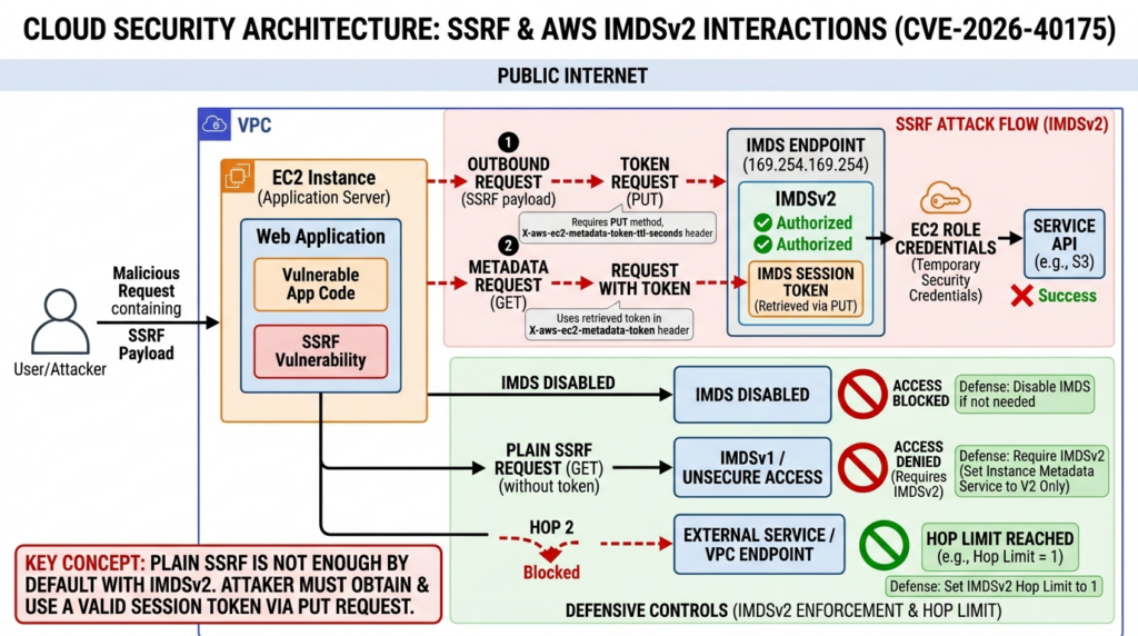 AWS metadata access is central to the advisory’s worst-case story because cloud credential theft is one of the most valuable SSRF outcomes in real environments. But the reference to IMDSv2 matters precisely because IMDSv2 is harder to abuse than IMDSv1. AWS documents that IMDSv2 is session-oriented. A client first makes a PUT request to obtain a token and then uses that token in a follow-up request header to retrieve metadata. That extra method and header requirement breaks many simple SSRF patterns that would have worked against weaker metadata setups. (docs.aws.amazon.com)