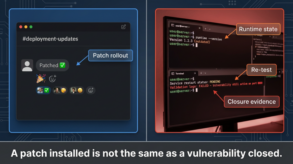 - Compensating controls (WAF, reverse proxy, EDR, sandboxing)