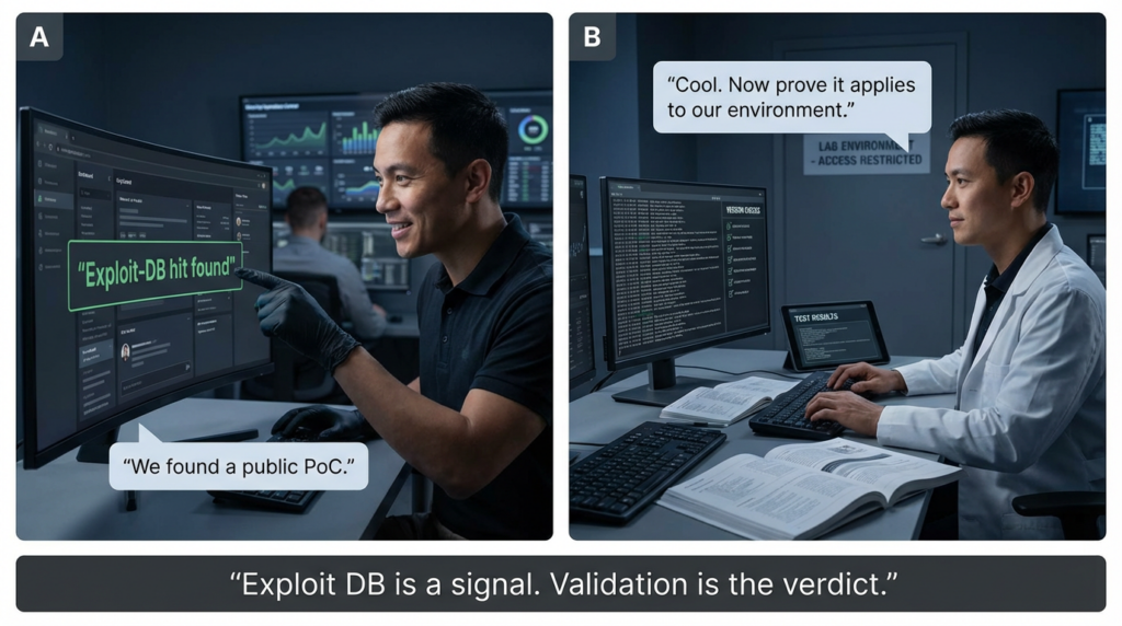 That is how you avoid two common failure modes: over-prioritizing a PoC that does not apply, and under-prioritizing a KEV issue just because no convenient Exploit-DB entry is available yet.