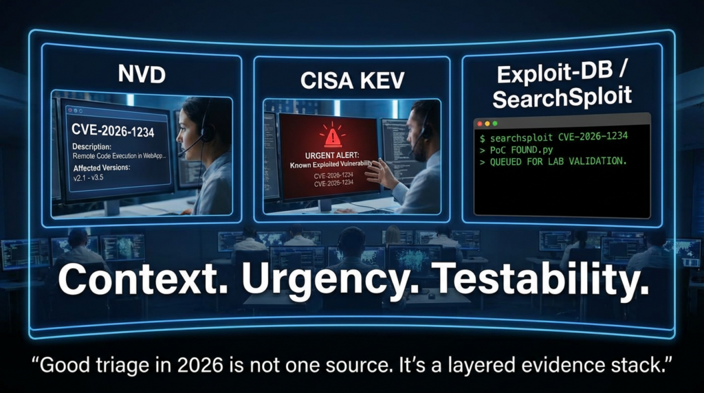 Use Exploit-DB and SearchSploit to accelerate triage, enrich context, and design tests. Use NVD, vendor advisories, and CISA KEV to ground prioritization and urgency. Use your own controlled validation and retesting to determine the truth about your environment.