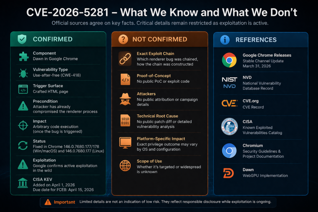 This is where a lot of otherwise decent vulnerability writing falls apart. Once a bug is labeled a zero-day, a surprising number of articles start quietly replacing documented facts with imagined detail. CVE-2026-5281 does not need that treatment. The real record is already serious enough. (Chrome Releases)
