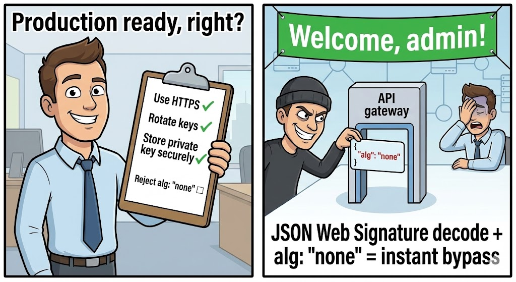 - Scenario: The server expects an RS256 token (signed with a Private Key, verified with a Public Key).