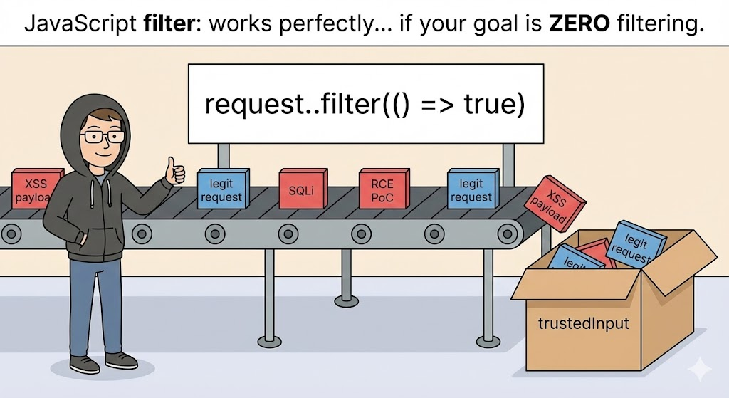 However, for the adversarial security engineer and the red teamer, the concept of a “filter” in JavaScript represents a dangerous dichotomy. On one side, it is the root cause of widespread Contrôle d'accès côté client vulnérabilités. D'autre part, la flexibilité du langage JavaScript lui-même transforme les méthodes de filtrage en de puissantes méthodes de filtrage. gadgets pour contourner les pare-feu d'applications Web (WAF) et les dispositifs d'assainissement des entrées.