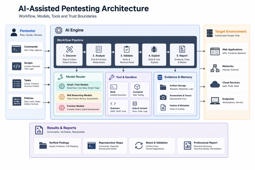 A realistic AI pentesting system starts with boundaries, not prompts. Before any model sees a target, the system should already know the authorized hosts, the forbidden host classes, the maximum request rate, the identities and roles available for authenticated testing, the categories of actions that require explicit approval, and the artifacts that must be preserved for later review. Models become dangerous mostly when they are not embedded in policies that outlive their momentary fluency. A strong agent is not safer because it is stronger. It is safer because it is more precisely bounded. That is as true for a frontier model as it is for a cheap one. (csrc.nist.gov)